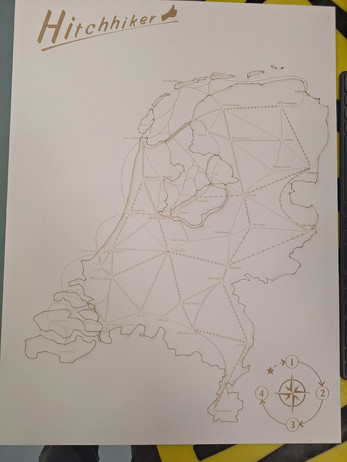 Hitchhiker is the result of my thesis project, a boardgame designed for dutch students in practical education about exploring cities and places in the Netherlands. Four players work together over four rounds to cover as much ground as possible and mark locations as visited, while trading cards and visiting key locations for additional points. By the end, players have dotted the map and collected symbols that mark their final score, and perhaps seen had their interest drawn by some of the locations they discovered along their journey.