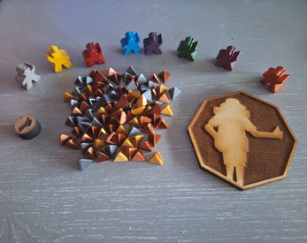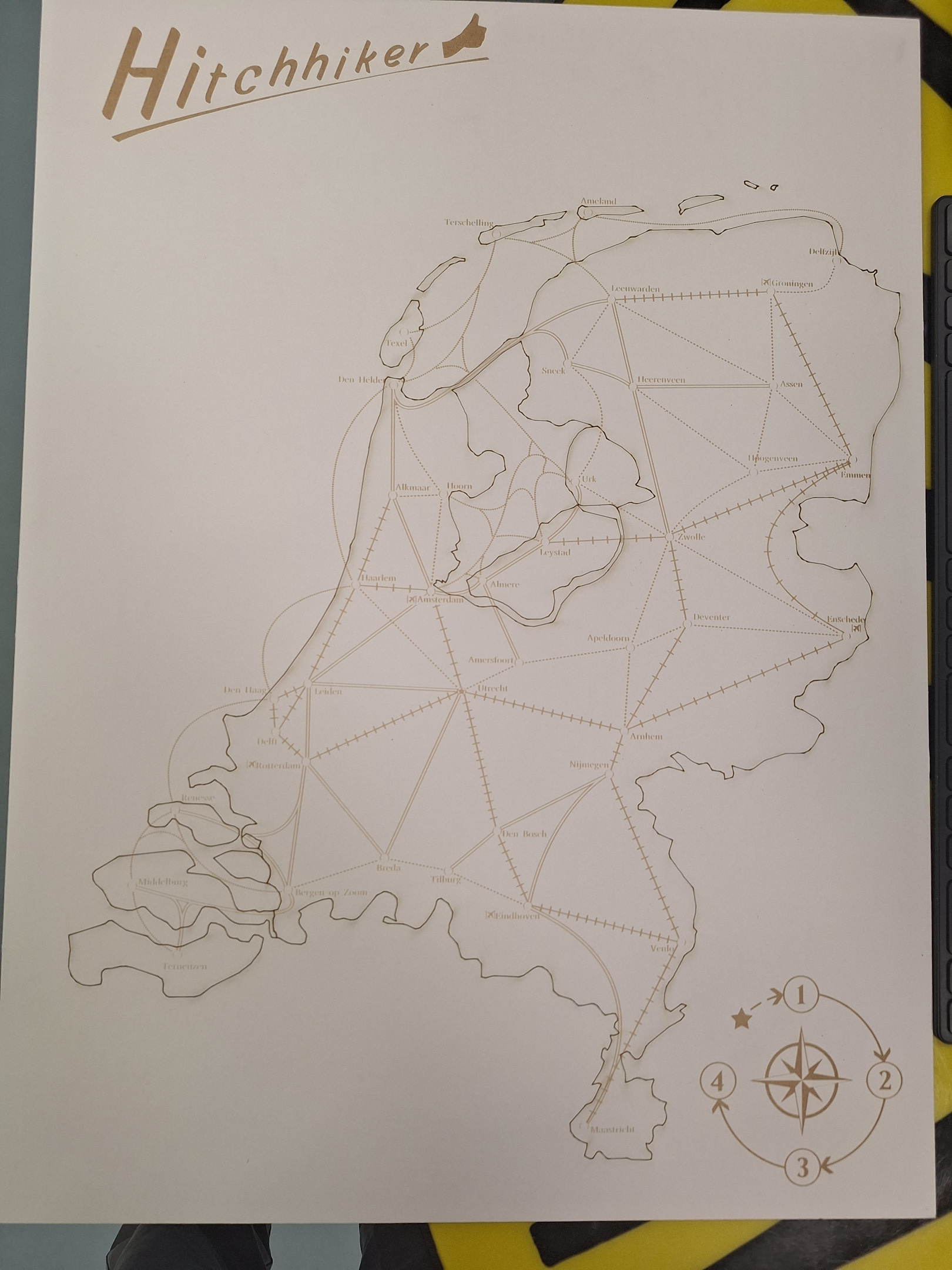 The example game in the pictures was made with a laser-engraved wooden board, laser-cut & 3D printed tokens and pieces, and shop-printed cards. The asset also includes a printable pdf of the rules (in english & dutch). The code for the android app made in Unity can be found here: https://gitlab.com/everlastingbuffoon/hitchhiker